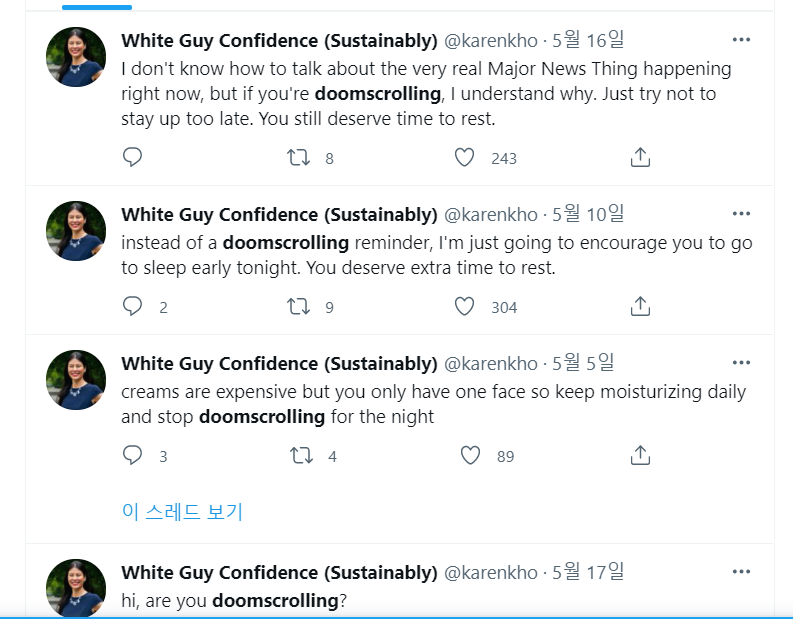이 'Doomscrolling'이란 단어는 작년에 저널리스트인 'Karenho'가 트위터에 이런 단어를 쓰기 시작하면서 유행하기 시작했고 현재 사전에도 등재되어 있습니다.