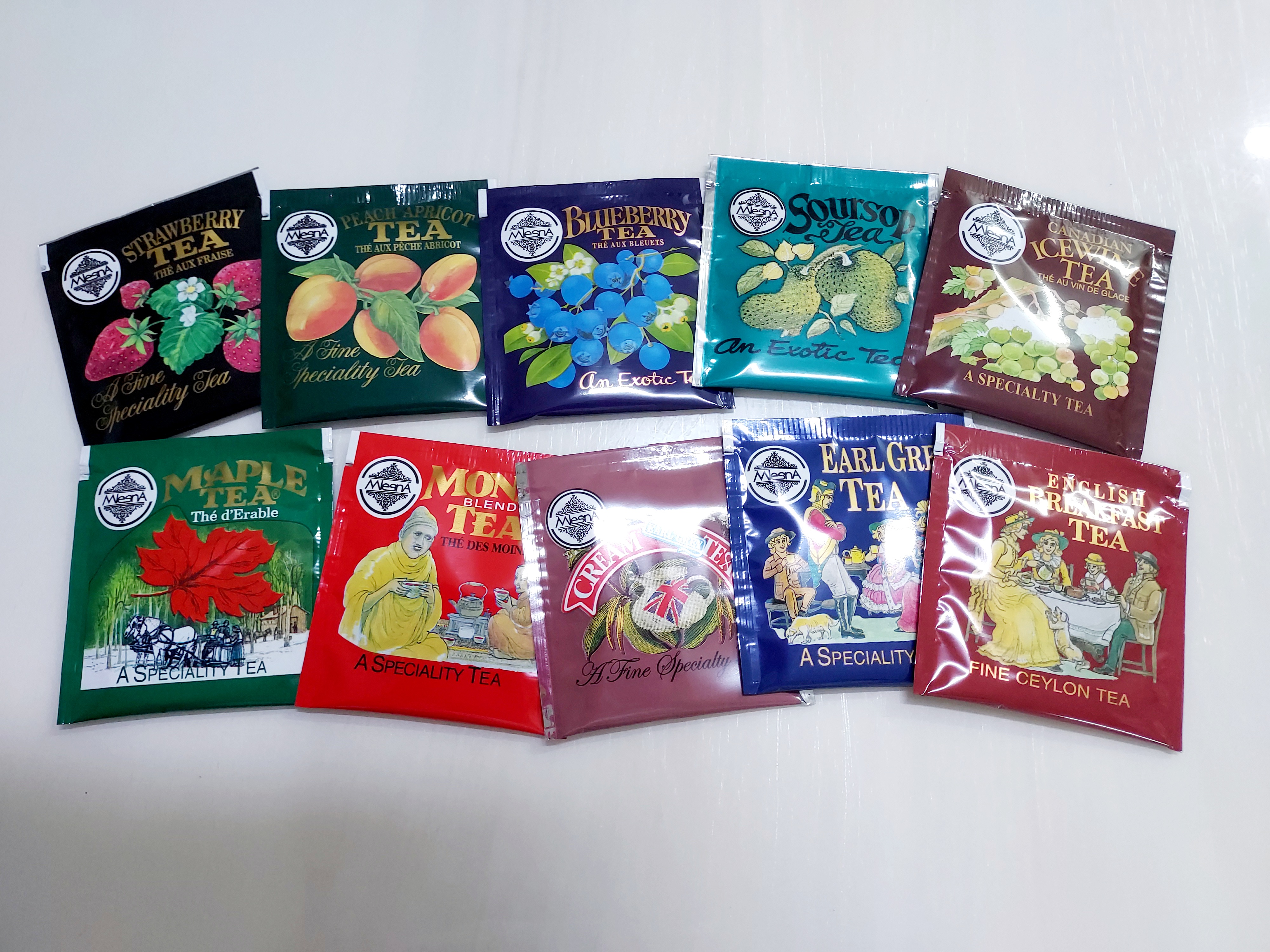 믈레즈나 티러버스 컬렉션은 총 10가지의 홍차잎이 있으며 각 종류마다 2개씩 총 20개의 티백이 들어 있습니다.
