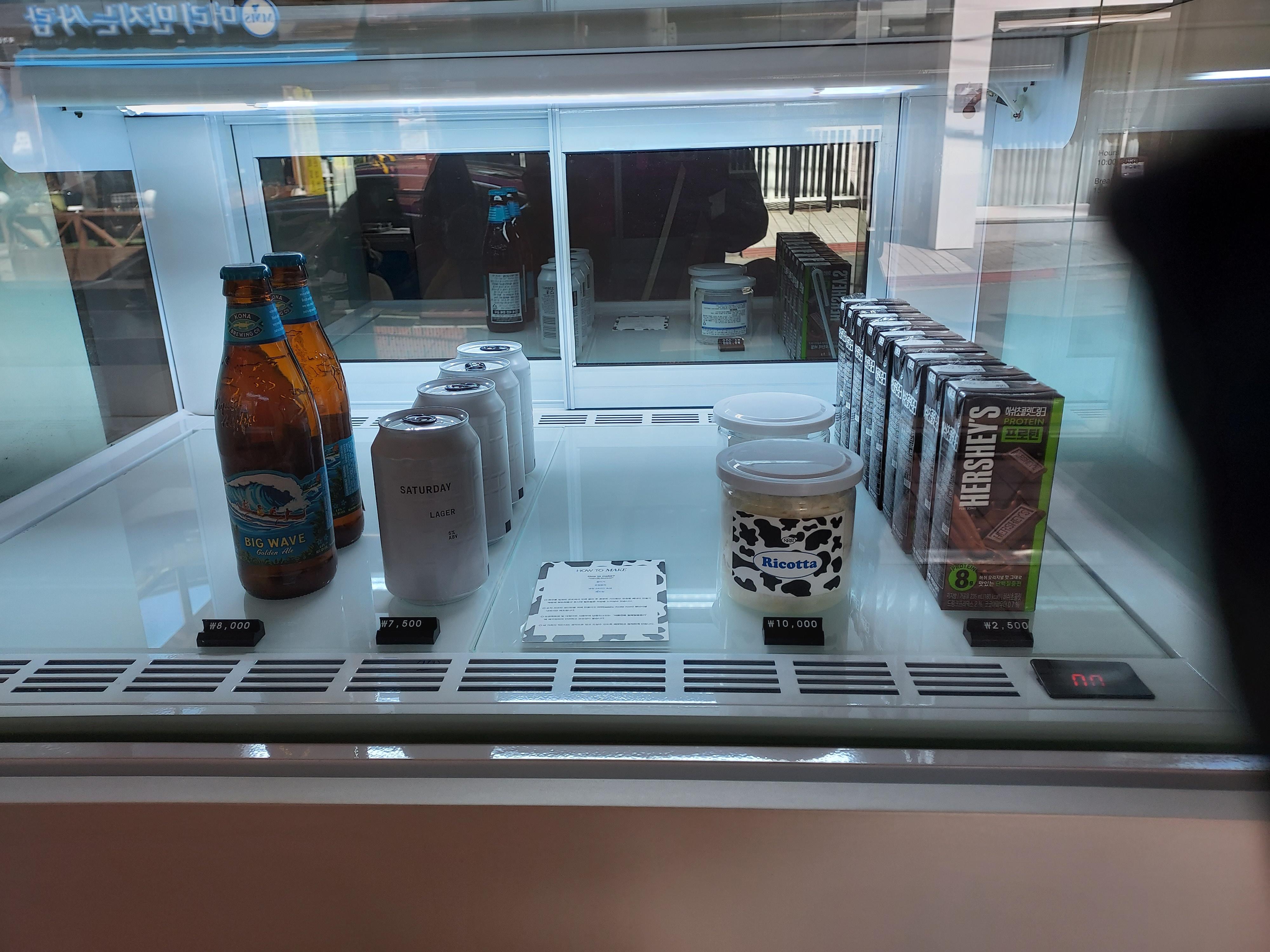 매장내는 약간 어두운 조명인 편이고 카운터에는 맥주 및 우유도 있어서 음료수도 시켜 먹을 수 있습니다.